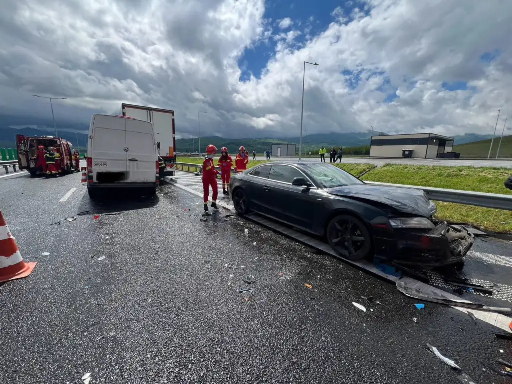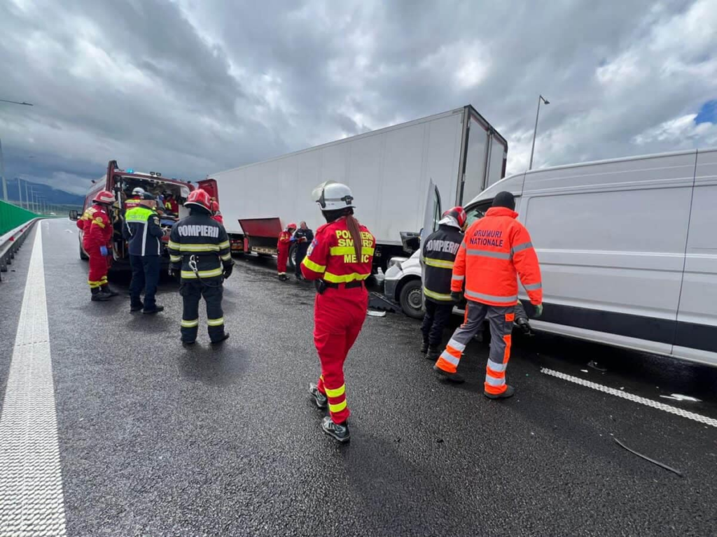 Accidentul de pe autostrada A1 de la Veștem a dus la rănirea gravă a unui bărbat. Un microbuz s-a ciocnit cu un TIR, iar în apropiere alte două mașini au lovit parapetul.