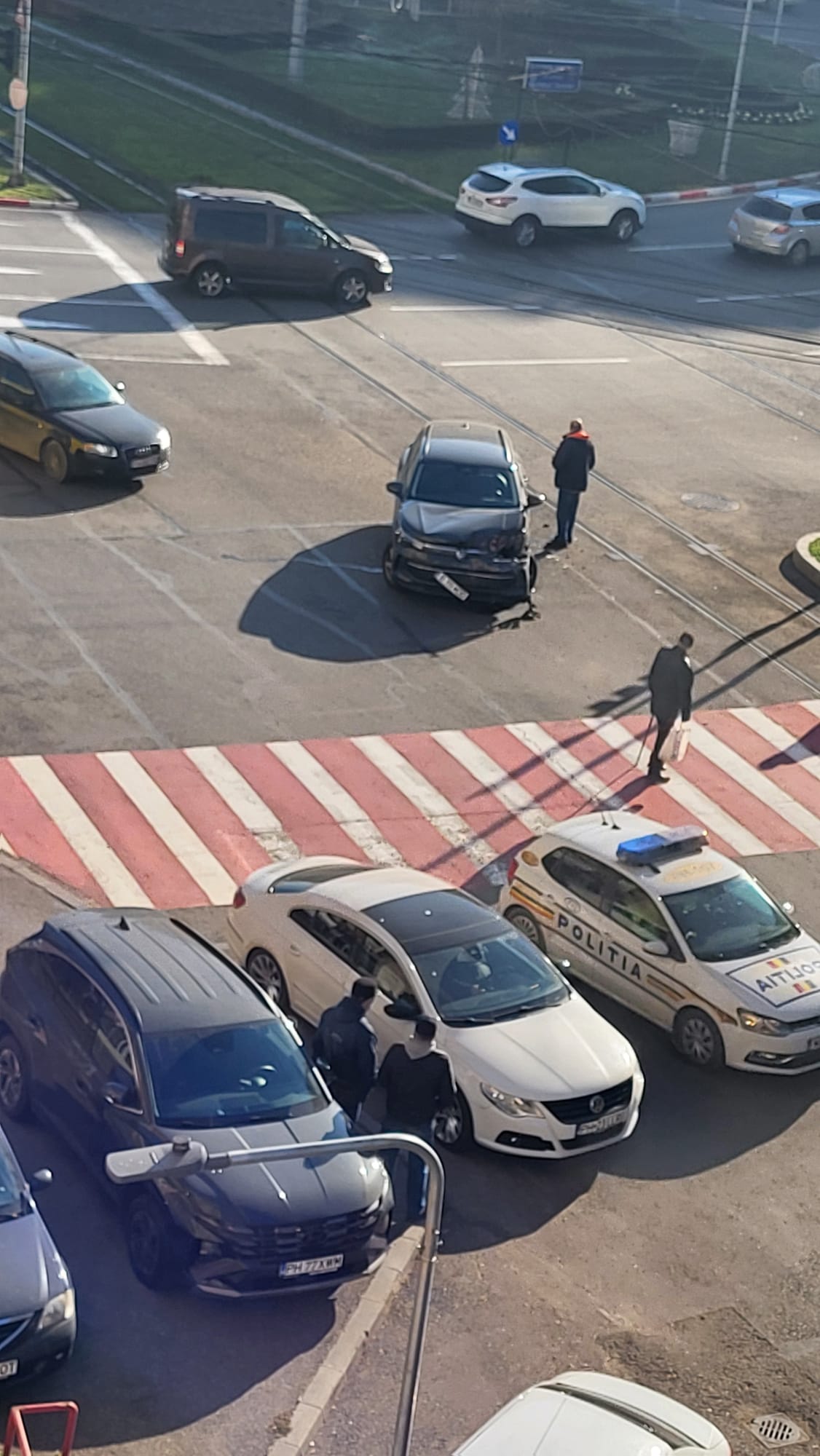 Evenimentul s-a produs pe fondul unui posibil neacordări de prioritate sau manevre greșite în rond, iar mașina a fost lovită de tramvai în timpul traversării sensului giratoriu.