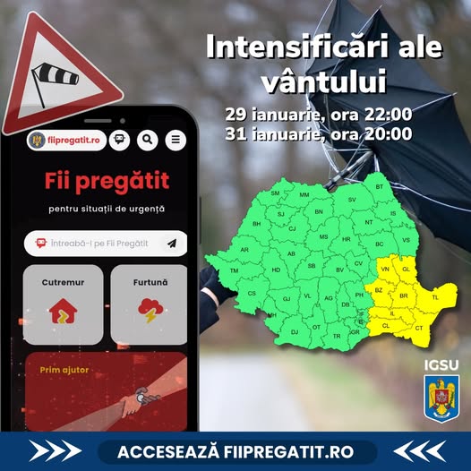 Inspectoratul General pentru Situații de Urgență anunță că, începând din această seară și până sâmbătă, ora 20:00, mai multe regiuni ale țării vor fi afectate de intensificări puternice ale vântului