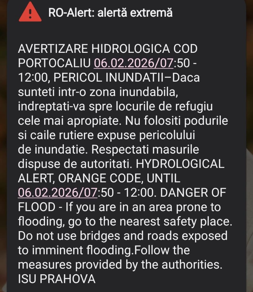 ISU Prahova a emis vineri dimineață o alertă RO‑Alert de tip extrem, semnalând un risc major de inundații în mai multe zone ale județului