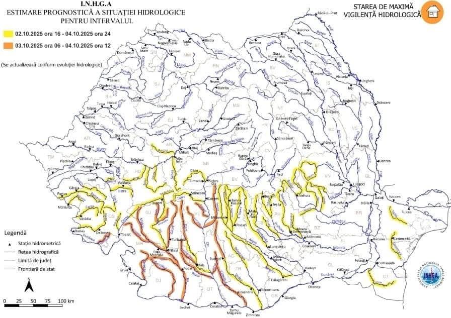 Interval de valabilitate: 02 octombrie 2025, ora 16:00 – 04 octombrie 2025, ora 24:00. Fenomenul hidrologic prognozat constă în scurgeri importante pe versanți, torenți și pâraie, viituri rapide pe râurile mici cu posibile efecte de inundații locale, precum și creșteri de debite și niveluri pe unele râuri din bazinele hidrografice vizate, cu risc de depășire a cotelor de apărare.