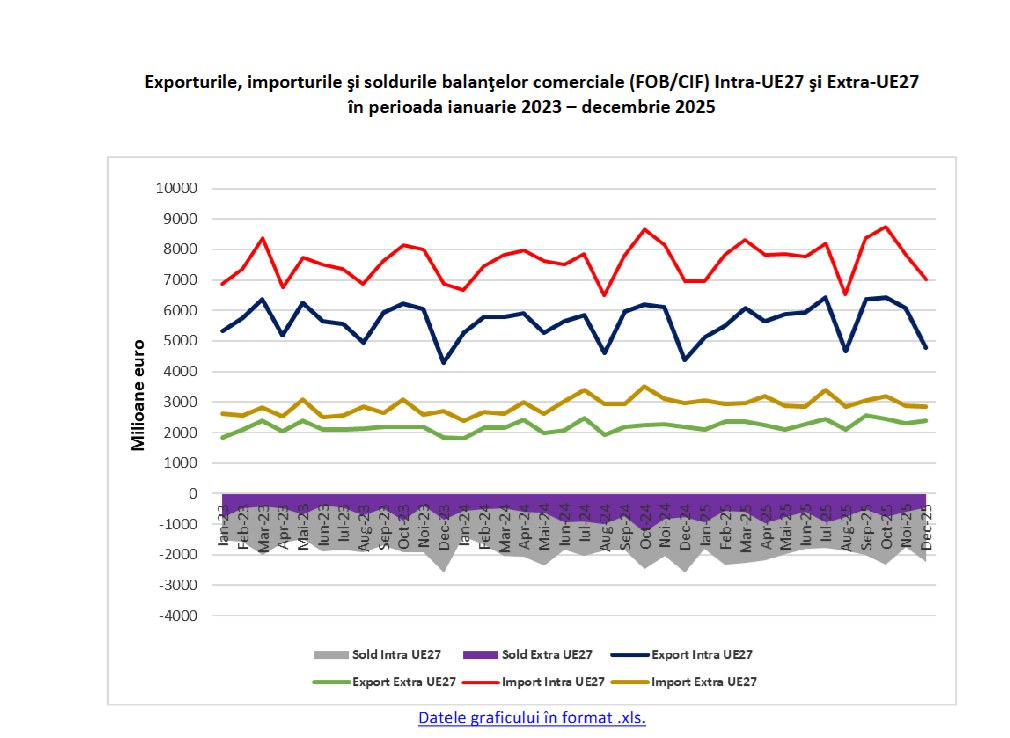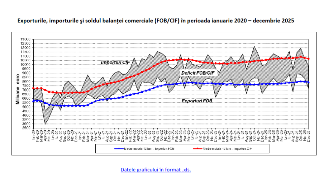 Luna decembrie 2025 a fost deosebit de performantă pentru exportatori, înregistrându-se o creștere de 9,4% a exporturilor față de decembrie 2024, în timp ce importurile au cunoscut o ușoară contracție de 0,4%. În ultima lună a anului, deficitul comercial a fost de 2.687,0 milioane euro.