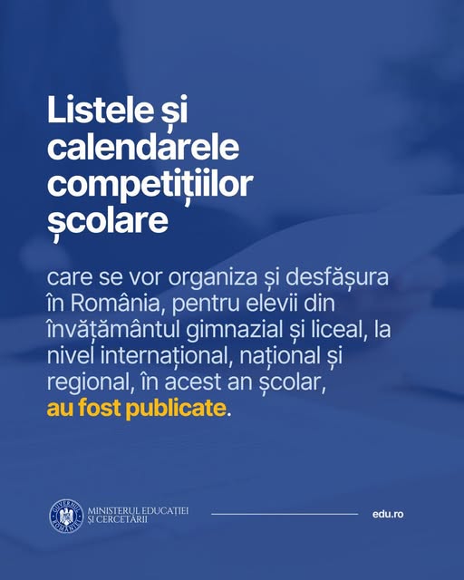 Ministerul Educației a publicat listele complete și calendarul de desfășurare pentru competițiile școlare internaționale, naționale și regionale care vor avea loc în anul școlar 2025-2026. Documentele stabilesc cadrul oficial pentru organizarea concursurilor dedicate elevilor din ciclurile gimnazial și liceal.
