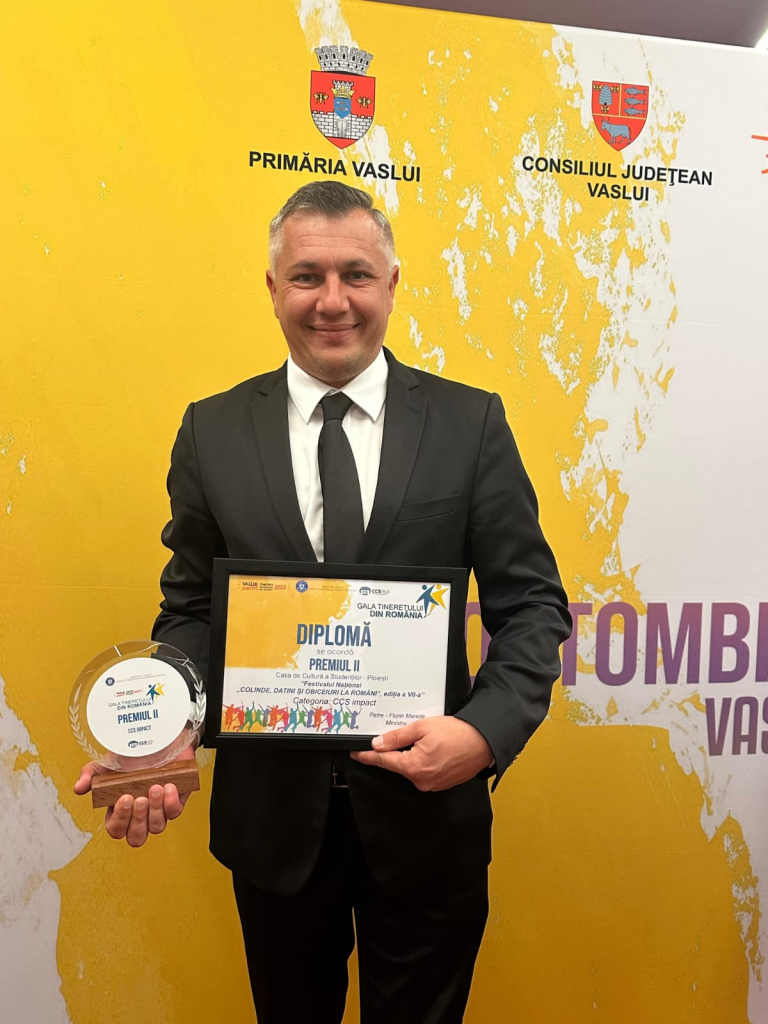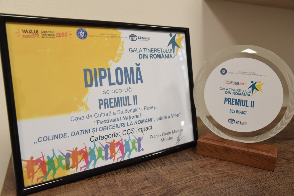 Casa de Cultură a Studenților (CCS) Ploiești a obținut Premiul II la Gala Tineretului din România 2025, pentru proiectul „Festivalul Naţional «Colinde, datini şi obiceiuri la români»”, în cadrul secțiunii speciale „CCS Impact”!