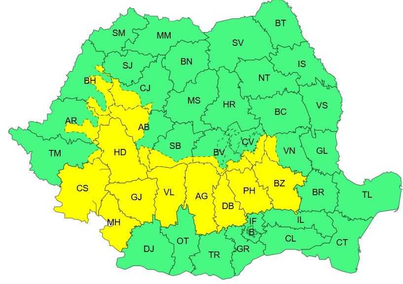 Administrația Națională de Meteorologie a emis o atenționare cod galben, valabilă de luni, 26 ianuarie, ora 08:00, până marți, 27 ianuarie, ora 10:00, ce vizează mai multe zone din țară, conform informațiilor și hărții transmise de instituție