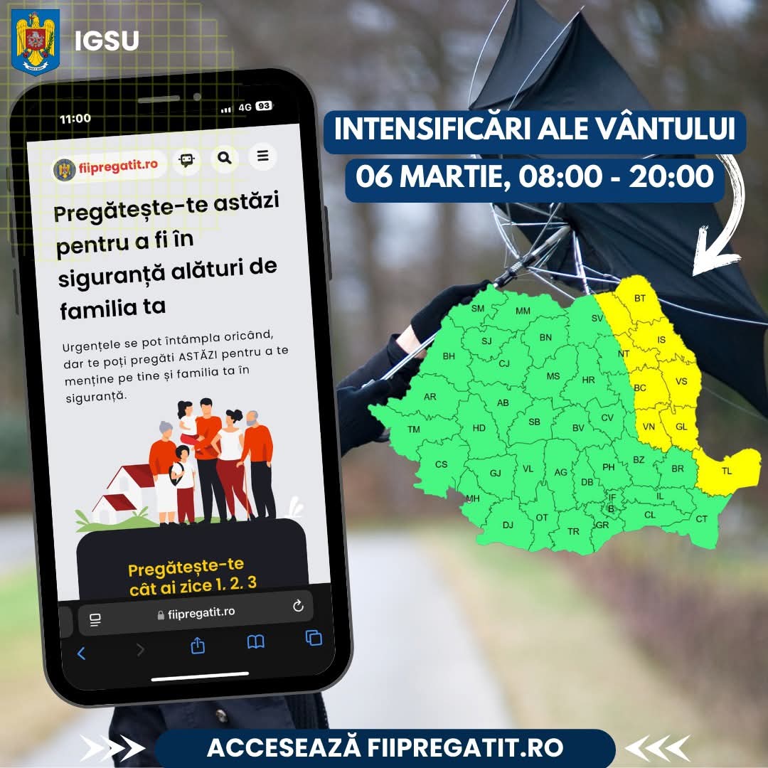 Administrația Națională de Meteorologie (ANM) a emis o nouă avertizare de tip Cod Galben, valabilă pentru ziua de vineri, 6 martie 2026, care semnalează intensificări semnificative ale vântului