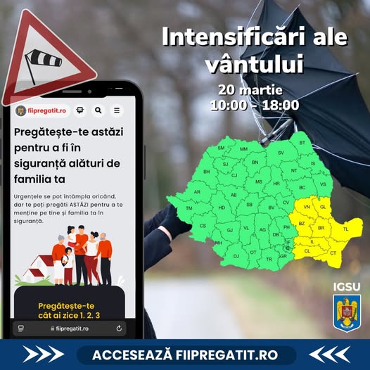 Administrația Națională de Meteorologie (ANM) a emis o atenționare meteorologică de tip Cod Galben, valabilă pentru ziua de vineri, 20 martie, în intervalul orar 10:00 – 18:00