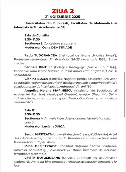 - Secțiunea 3: Contestare și consens (Sala de Consiliu), moderată de Oana DEMETRIADE, cu intervenții despre proteste studențești (Radu TUDORANCEA), Securitate și Miliție (Gianina BUZEA) și industrializare (Angelica Helena MARINESCU).