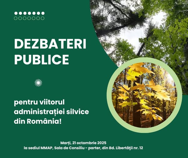Ministerul Mediului – România anunță două dezbateri publice importante care vor avea loc marți, 21 octombrie 2025, la sediul MMAP din Bd. Libertății nr. 12, București (Sala de Consiliu, parter), dedicate viitorului administrării și reorganizării silviculturii în România