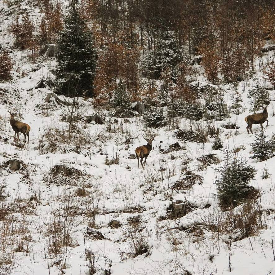Imaginile, făcute publice vineri de Regia Națională a Pădurilor – Romsilva, au fost realizate în cantonul silvic Valea Sării. Animalele au fost observate explorând versanții abrupți, trecând prin zone cu regenerări tinere de molid, dar și retrăgându-se la adăpostul pădurii.