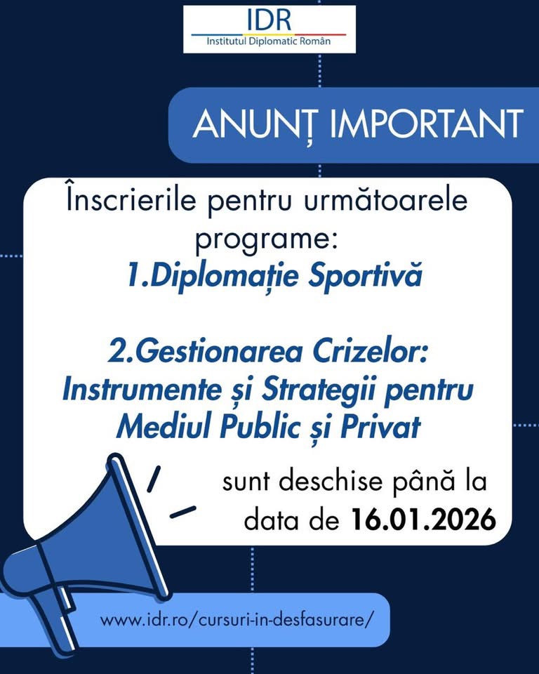 Institutul Diplomatic Român (IDR) anunță demararea, începând cu 19 ianuarie 2026, a două noi programe de dezvoltare și perfecționare profesională, dedicate specialiștilor din sectorul public și privat