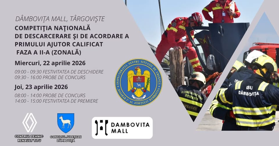 În perioada 21–23 aprilie 2026, Inspectoratul pentru Situații de Urgență „Basarab I” al județului Dâmbovița va fi gazda fazei zonale a Competiției Naționale de Descarcerare și de Acordare a Primului Ajutor Calificat.