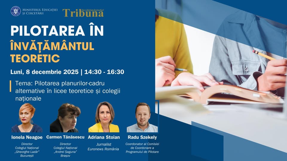 Cel de-al doilea eveniment online este programat pentru luni, 8 decembrie 2025, între 14:30 și 16:30, și se va concentra pe modul în care aceste planuri vor fi pilotate în liceele teoretice și colegiile naționale.