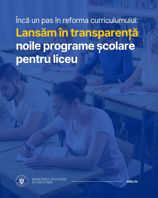 Începând de astăzi, 24 noiembrie, și până miercuri, 26 noiembrie 2025, Ministerul Educației și Cercetării publică în transparență propunerile de programe școlare pentru clasa a IX-a, aferente noilor planuri-cadru ce vor intra în vigoare din anul școlar 2026–2027