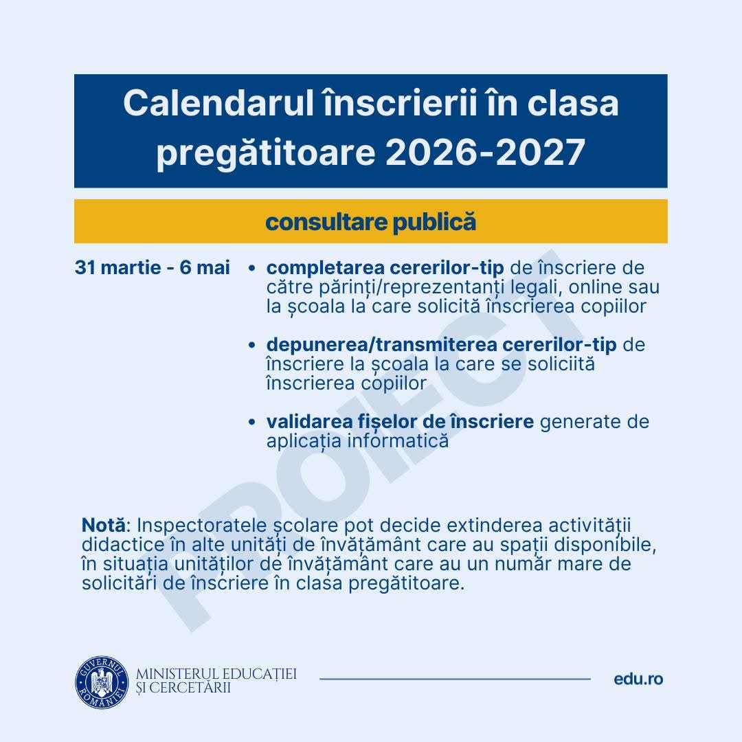 Ministerul Educației și Cercetării a lansat în consultare publică proiectul calendarului pentru înscrierea în clasa pregătitoare pentru anul școlar 2026 – 2027, oferind părinților toate informațiile necesare pentru planificarea educației copiilor lor