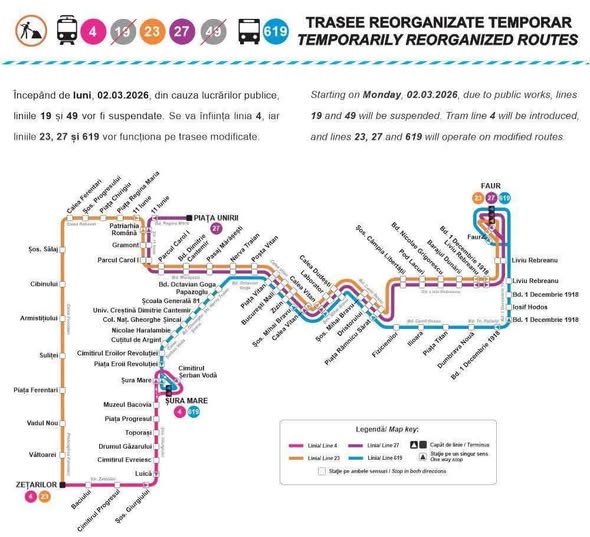 Ca primă măsură, circulația tramvaielor de pe liniile 19 și 49 va fi suspendată complet pe întreaga durată a intervențiilor. Totodată, tramvaiele liniilor 23 și 27, alături de autobuzele de noapte N104 și N122, vor fi redirecționate și vor circula exclusiv pe rute deviate.