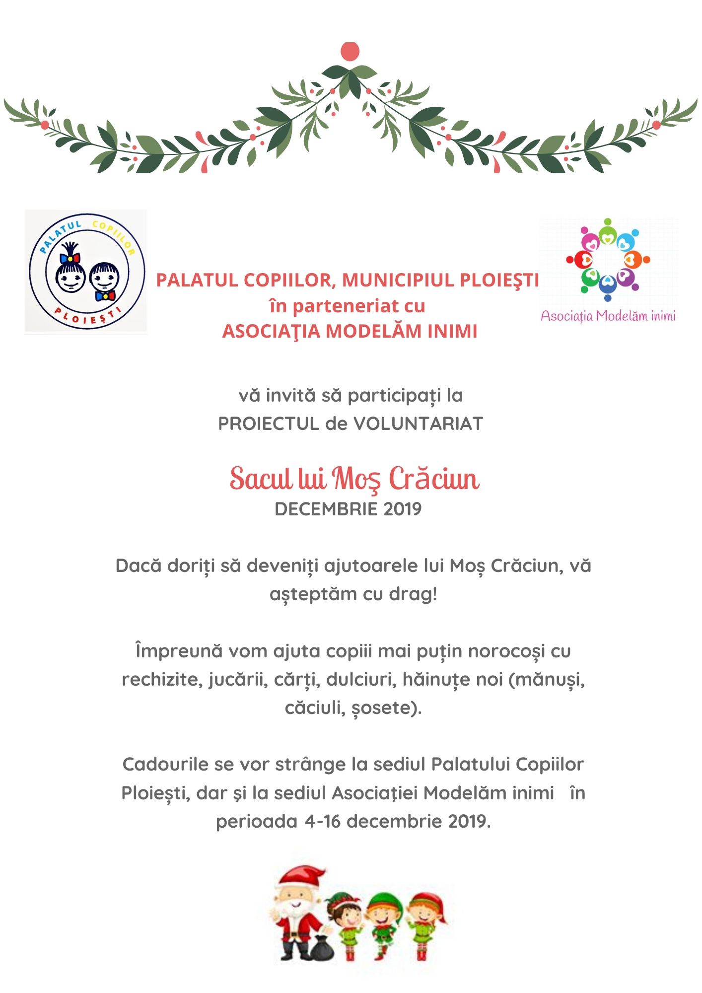 Iată de ce, reprezentanţii Palatului Copiilor Municipiul Ploiești împreună cu Asociația Modelăm inimi, organizează în perioada 4- 16 decembrie campania umanitară „Sacul Lui Moș Crăciun ”. Scopul campaniei este acela de colectare a de donaţii, sub orice formă (rechizite, alimente, jucării, hăinuţe sau donaţii în bani) pentru a ajuta copiii sărmani din mai multe localităţi din judeţul Prahova să simtă spiritul sărbătorilor de iarnă.