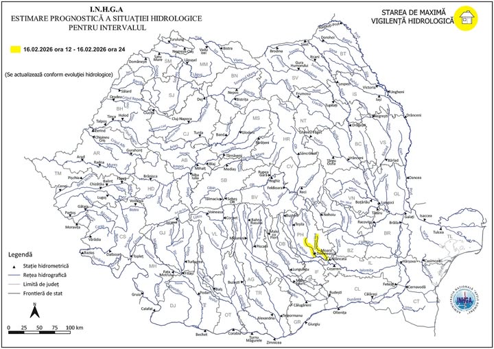 Institutul Național de Hidrologie și Gospodărire a Apelor (INHGA) a emis astăzi, 16 februarie 2026, o avertizare de tip Cod galben de inundații valabilă pentru mai multe cursuri de apă din sudul țării