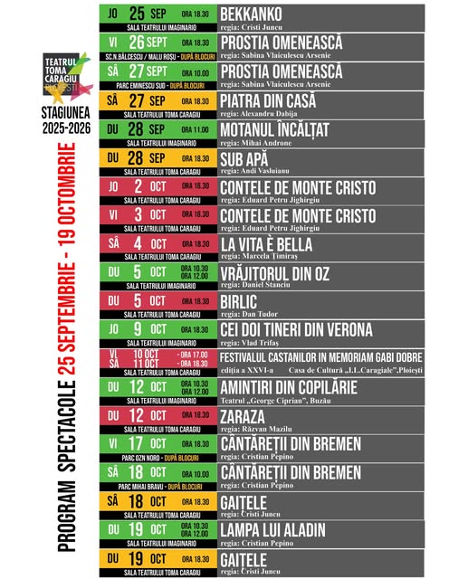 Teatrul „Toma Caragiu” Ploiești anunță oficial programul spectacolelor pentru perioada 25 septembrie – 19 octombrie 2025, marcând începutul unei noi stagiuni teatrale pline de diversitate, emoție și spectacole pentru toate vârstele