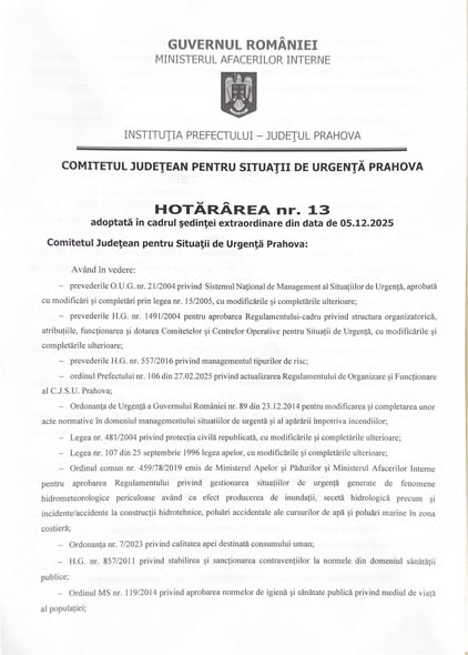 Comitetul Județean pentru Situații de Urgență Prahova a adoptat în această seară Hotărârea nr. 13/05.12.2025, prin care se stabilesc măsuri pentru furnizarea apei cu restricții către localitățile afectate, începând progresiv cu ora 23:00