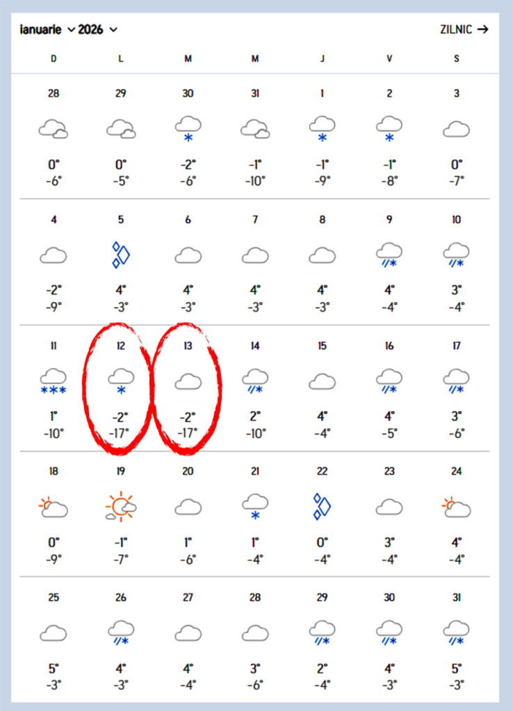 Potrivit AccuWeather, pe 12 și 13 ianuarie, termometrele vor indica până la -17 grade Celsius, iar temperaturile negative se vor menține pe toată durata lunii ianuarie.