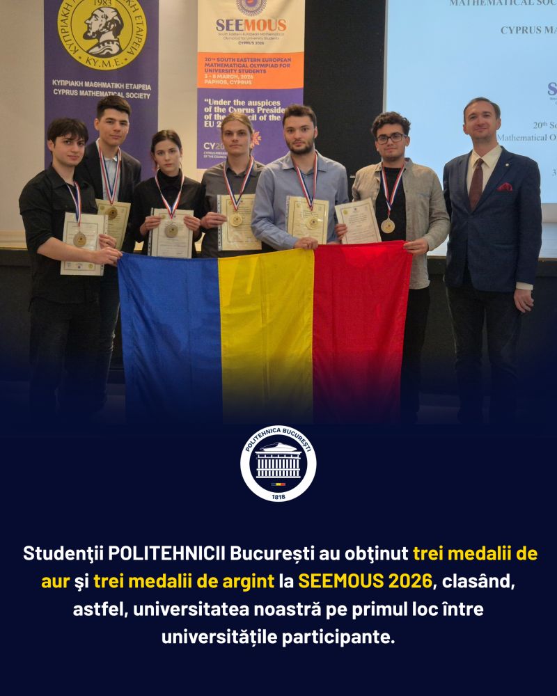 O echipă formată din studenți de excepție a reușit să obțină rezultate remarcabile la cea de-a XX-a ediție a competiției de matematică SEEMOUS (South Eastern European Mathematical Competition for University Students), eveniment de prestigiu desfășurat în perioada 3–8 martie 2026, în orașul Pafos din Cipru.