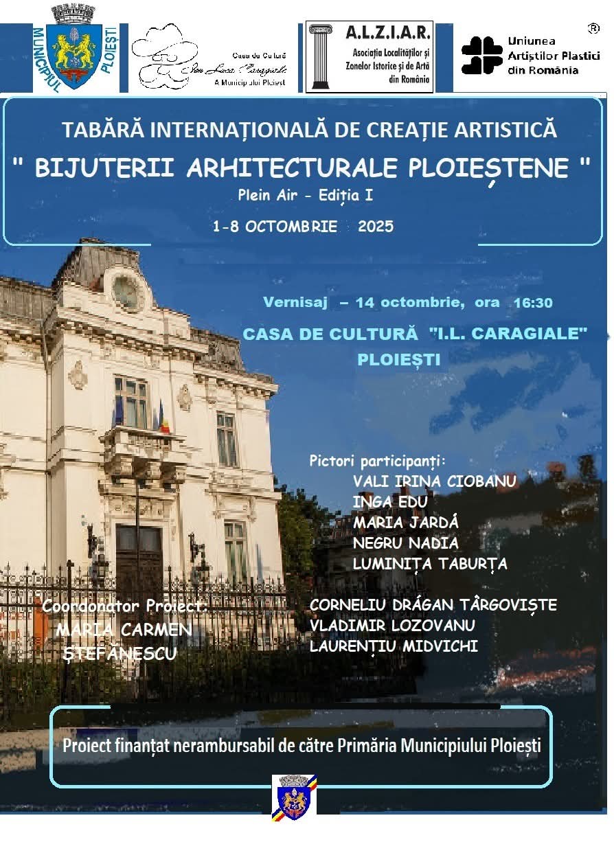 Casa de Cultură „Ion Luca Caragiale” a Municipiului Ploiești organizează astăzi, 14 octombrie 2025, de la ora 16:30, vernisajul Taberei Internaționale de Creație Artistică „Bijuterii Arhitecturale Ploieștene”, ediția I