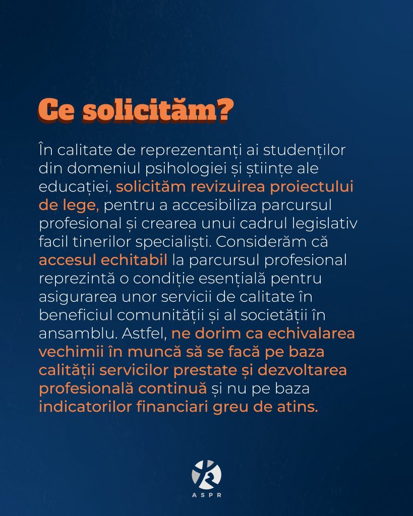 Apelul ASPR către Senat. În data de 14 ianuarie 2026, asociația a cerut oficial Senatului României revizuirea acestui proiect. Studenții solicită un cadru legislativ echitabil, care să pună preț pe competențe și educație, nu pe capacitatea de a genera profit imediat după terminarea facultății.