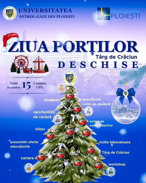 Universitatea Petrol-Gaze din Ploiești organizează luni, 15 decembrie, în intervalul 10:00–15:00, evenimentul „Ziua Porților Deschise – Târg de Crăciun”, dedicat viitorilor studenți, comunității academice și publicului larg